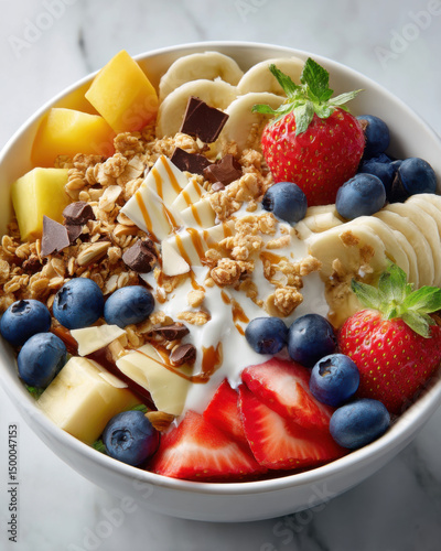 A healthy breakfast bowl features a vibrant mix of fresh strawberries, blueberries, banana slices, mango cubes, granola, yogurt, and chocolate pieces creating joy.