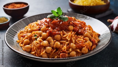 A hearty plate of Egyptian Koshari, featuring a mix of rice, lentils, chickpeas, and pasta, topped with crispy onions and a spicy tomato sauce.