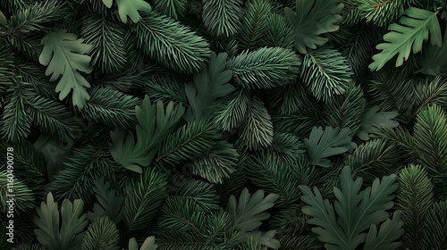 A highly detailed close-up of fir tree branches forming a seamless texture for a Christmas banner, with the rich dark green tones subtly accented by soft gradients of shadow and li