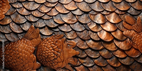 a horizontal format of hammered copper scales as a background in a Decor-themed, photorealistic illustration in JPG. Generative ai