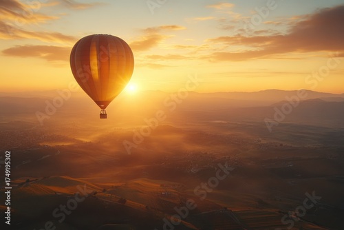 hot air balloon, sunrise, golden hour, landscape, aerial view, mountain, rolling hills, mist, fog, sky, cloud, nature, outdoors, travel, adventure, scenic, beautiful, serene, peaceful, vale, horizon, warm light, orange sky, silhouette, dawn, tranquil, floating, flight, freedom, exploration, idylli, vista, panoramic, air travel, ballooning, morning light, atmospheric, wilderness