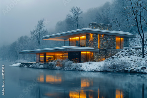 winter, tree, sky, fog, water, building, house, snow, landscape, lake, nature, blanket, home, exterior, modern, snowy, stone, surround, shore