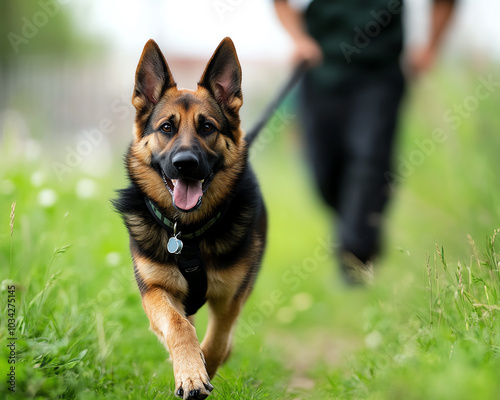 dog, shepherd, running, leash, owner, nature, path, green, happiness, pet, companion, joy, animal, play, exercise, walk, bond, canino, breed, loyalty, adventure, friendship, motion, lifestyle, training, activity, scene, landscape, vibrant, sunny, energy, freedom, love, spirit, enthusiasm, vitality, trust, exploration, connection, agility, foliage, interaction, smile, engagement, healthy, fun, beauty
