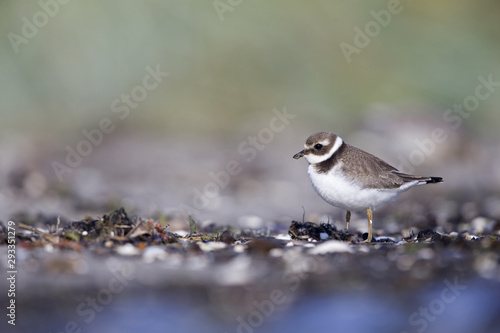 A juvenile common ringed plover (Charadrius hiaticula) resting and foraging during migration on the beach of Usedom Germany.