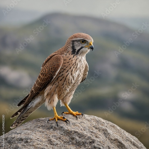 A kestrel standing on a rock with fine details of its talons and feathers, clear white background.