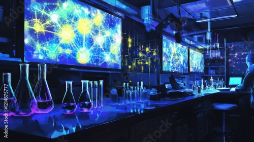 A lab researching biodegradable plastics, with test tubes and glowing chemical structures displayed on monitors