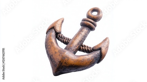 A large anchor is tied to a rope, set against a clean white background, illustrating maritime themes and nautical symbolism.