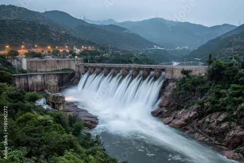 dam, river, water, mountain, spillway, dusk, twilight, landscape, nature, power, energy, hydroelectric, concrete, structure, engineering, flow, current, rush, cascade, fast, motion blur, green, lush, tree, vegetation, hill, vale, serene, calm, peaceful, majestic, impressive, large, massive, strong, powerful, grey, brown, rock, stone, cliff, bank, light, illumination, night, evening, scene, view, panorama
