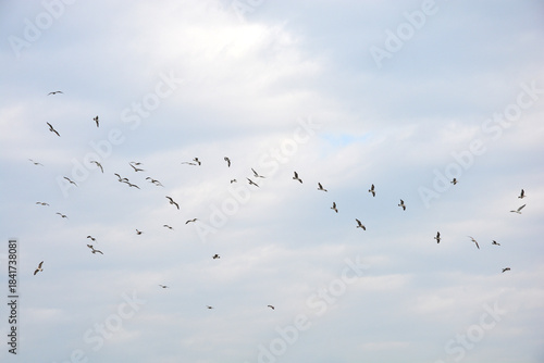 A large flock of seagulls is captured in flight against a bright, cloudy, pale blue and gray sky