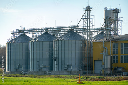 A large modern plant for the storage and processing of grain crops. view of the granary on a sunny day. Large iron barrels of grain. silver silos on agro manufacturing plant for processing and drying