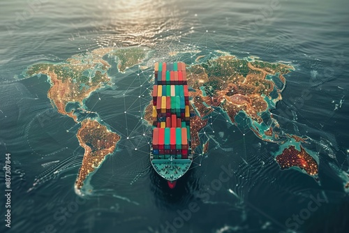 A large ship is sailing through the ocean with a globe in the background