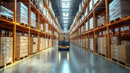 A large warehouse with a pallet truck and boxes on shelves, a warehouse with a pallet truck and cardboard boxes on a shelf, and Shelves with boxes in a warehouse. Generative Ai