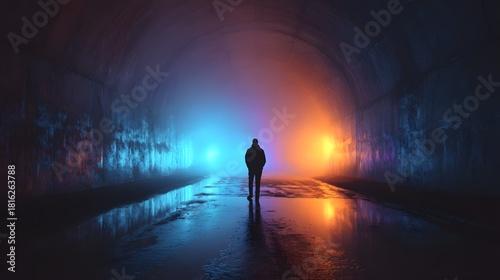 silhouette, figure, person, man, hooded, hoodie, alone, solitary, standing, walking, path, road, street, wet, puddle, night, dark, light, lighting, blue, orange, colourful, contrast, fog, foggy, mist, misty, haze, atmospheric, cinematic, dramatic, glow, glowing, beam, tree, forest, wood, background, mysterious, moody, eerie, skittish, creepy, mystery, loneliness, solitude, journey, choice
