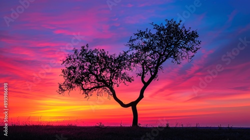 A lone tree silhouetted against a vibrant sunset, its branches reaching towards the sky like the outstretched arms of a dancer, a symbol of hope and resilience.