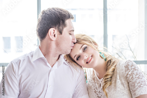 A loving beautiful couple hugging and kissing by the window