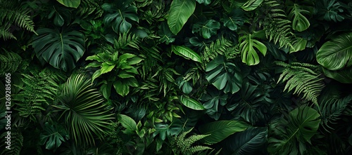 A lush green tapestry of tropical leaves featuring monstera and other foliage creates a dense jungle background with vibrant textures and natural beauty perfect for designs