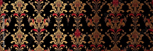 A luxurious black and gold damask pattern featuring a repeating floral motif in shades of red and purple, with subtle golden embroidery, black fabric, floral motifs, opulent textures
