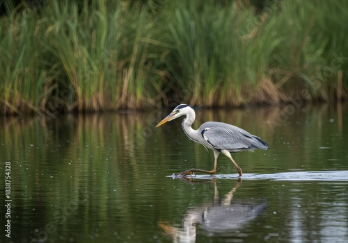 A magnificent grey heron wading through shallow water, hunting fish in a tranquil wetland environment under clear skies ,tranquil ,large ,wading bird