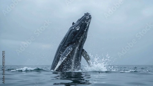 A majestic humpback whale breaks through the dark blue surface, its sleek black and white body arcing upwards in a stunning display of aquatic power