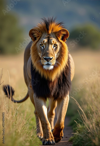 lion, majestic, predator, wildlife, africa, savanna, king, powerful, walking, stalking, intense, big cat, felino, mane, animal portrait, nature, wilderness, safari, hunter, fierce, confident, grass-land, wild, mammal, carnivore, beautiful, strong, trail, path, dominant, strength, courage, conservation, big five, wild animal
