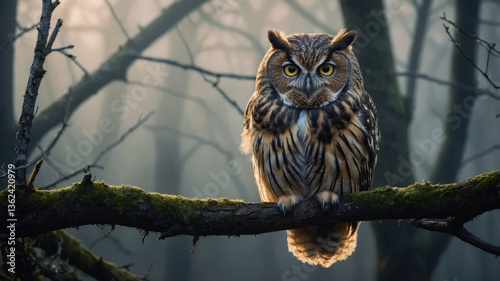 A majestic owl perched on a branch in a misty forest, showcasing its striking features.