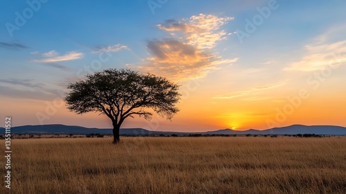 A majestic silhouette of an acacia tree at sunset surrounded by golden grasslands under a colorful evening sky : Generative AI