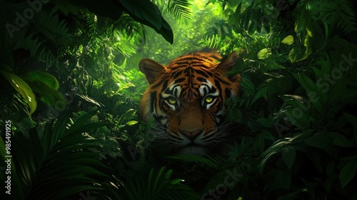 A majestic tiger hiding in a lush green jungle, showcasing its striking features and vibrant stripes amidst tropical foliage.