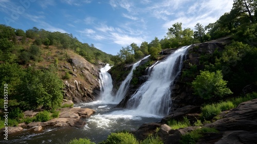 waterfall, cascade, nature, landscape, scenic, water, flowing, beautiful, natural, environment, outdoors, rock, stone, stream, river, motion, power, wild, lush, green, tree, vegetation, forest, hillside, slope, blue, sky, cloud, daylight, sunshine, serene, peaceful, tranquil, picturesque, erosion, geology, wet, refreshing, spray, mist, torrent, descent, plunge, beauty, earth, fluid, dynamic, rural, summer
