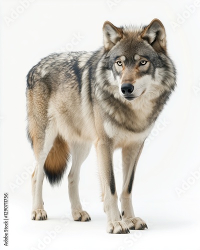 A majestic wolf with a thick coat, standing confidently against a white backdrop.