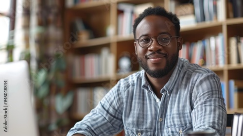 A male adult participating in an online study group, discussing topics and sharing insights with classmates from diverse backgrounds