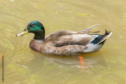 A male mallard (wild duck) is swimming in a pond.