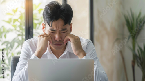 distressed, man, white shirt, laptop, frustration, work, workspace, modern, challenge, office, technology, stress, emotion, expression, business, computer, thoughtful, stressed, indoor, effort, concentration, digital, professional, tension, job, fatigue, struggle, productivity, daylight, window, indoor plant, serious, pressure, focused, emotional