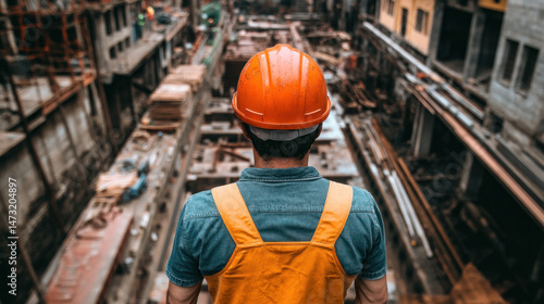 A man in a yellow vest and orange helmet stands in front of a building. The man is wearing a hard hat and is looking up at the building. Concept of caution and safety