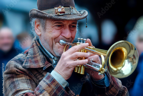 trumpet, music, jazz, instrument, musician, brass, playing, band, horn, player, play, people, blues, sound, musical, person, woman, orchestra, blowing, artist, trumpeter, senior, blow, concert, hat