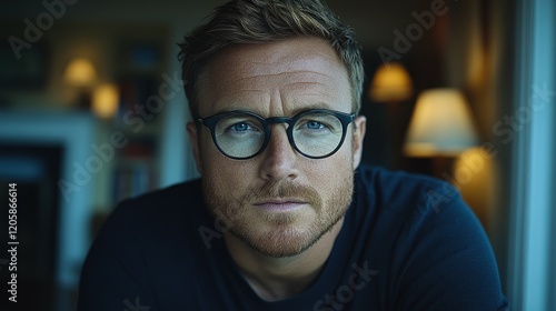 A man with a well-groomed beard and stylish glasses sits in a warmly lit room, deep in thought, creating an intimate atmosphere as evening approaches