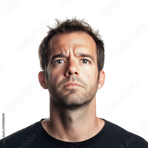 A Man with Stoic Expression Eyes Fixed Ahead Wearing a Black Shirt Looking Up Isolated on Transparent Background