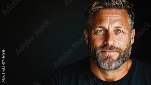 A man with styled short hair and a rugged beard smiles slightly, standing in front of a dark background, exuding confidence and approachability in casual attire.
