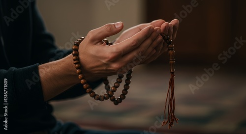 A Man's Hands Holding Prayer Beads in Humble Supplication, Seeking Spiritual Peace and Divine Guidance