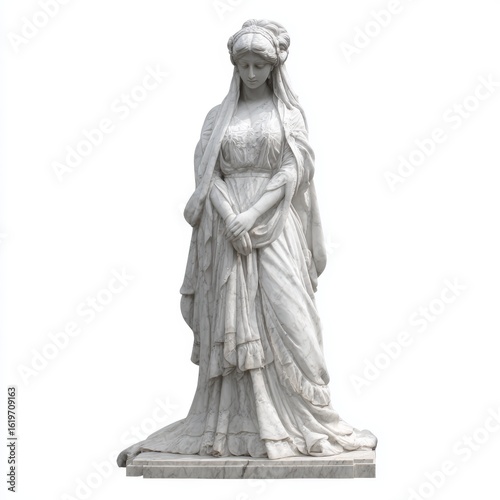 A marble statue of a woman in classical attire, captured with exquisite detail and artistry. She embodies grace and timeless elegance, in an outdoor setting