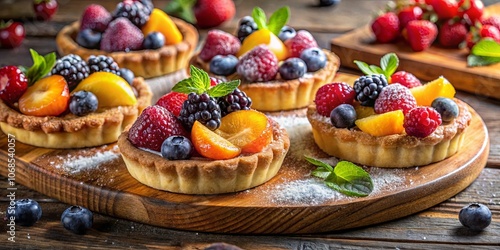 A medley of vibrant fruits adorns a rustic wooden board, creating a delightful and tempting arrangement of individual pastry cups.