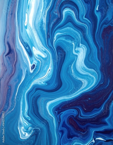 A mesmerizing fluid painting featuring swirling shades of deep blue and crisp white, creating a dynamic interplay of colors that evoke tranquility and movement.