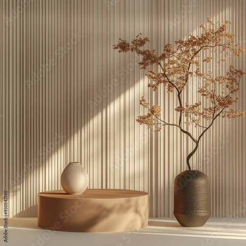A minimalistic an abstract pedestal podium display scene interior featuring a simple vase and a branch against warm, neutral tones in a tranquil setting