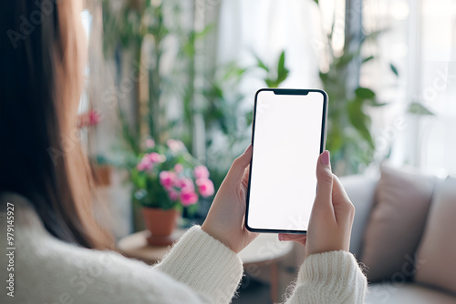A mockup of a phone in a woman's hands on the background of a room