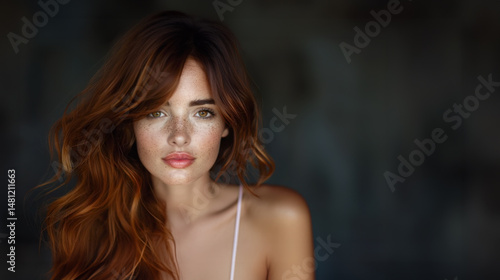 A model with freckles and long red hair and a pale complexion. Skin care and natural cosmetics. Copy space.