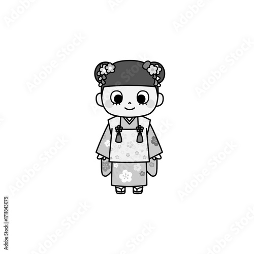 A monochrome hand-drawn illustration of a young girl in a Hifu Kimono, ideal for Shichi-Go-San celebration, New Year’s materials, and cultural design projects.