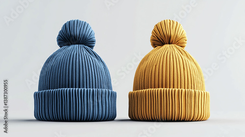 hat, beanie, cap, headwear, headgear, accessory, apparel, clothing, garment, knitwear, pom-pom, cuff, blue, yellow, gold, colourful, vibrant, bright, duet, pair, knit up, knitted, wool, woolen, threaded, fabric, textile, texture, textured, ribbed, soft, warm, cosy, comfortable, hand-made, winter, autumn, fall, cold, weather, season, seasonal, style, fashion, stylish, design, modern