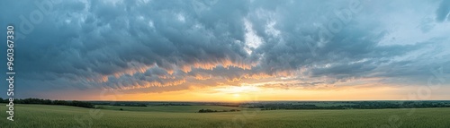 A panoramic view of a field with a dramatic, colorful sunset sky.