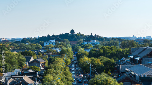 A panoramic view of the urban scenery of the streets with traditional buildings in Beijing, China