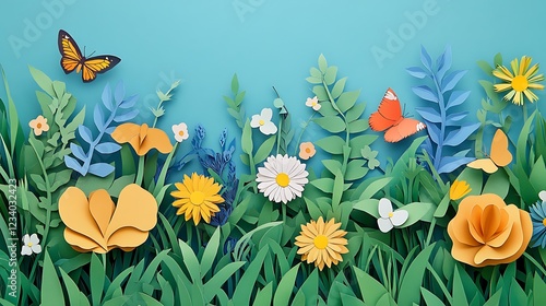 A paper cut of a lush meadow filled with wildflowers, butterflies, and tall grass under a sunny sky.