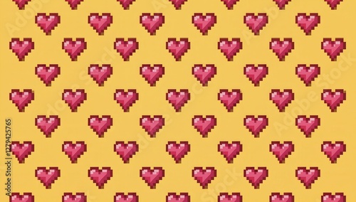 A pattern of pixelated hearts, evenly arranged on a pale yellow background.